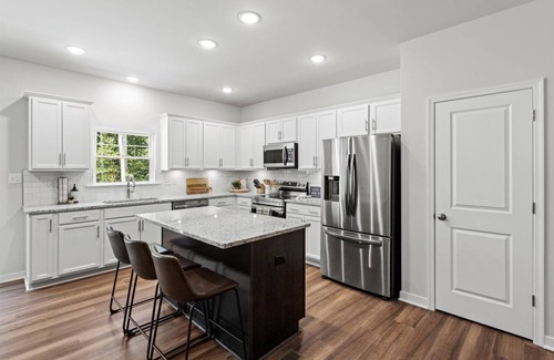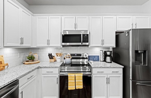 This 3 bedroom, 2 full bath, Craftsman style lake house comfortably sleeps 6 – 8 people and is perfect for up to 3 couples or 2 families with children. Inside, you will find a spacious living room featuring cathedral ceilings, comfy couches, a 70 inch flat screen TV with Netflix, Disney+ and Hulu with live TV channels available, a DVD player, and an electric fireplace. There are several classic board games provided, including games for the littlest family members!