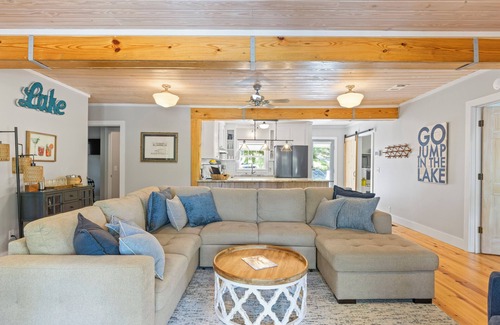 Spend sunny days swimming, boating, and fishing from your private dock, and cozy evenings around the lakeside firepit. Enjoy meals prepared in the fully equipped kitchen and relax in the welcoming open-concept living area.