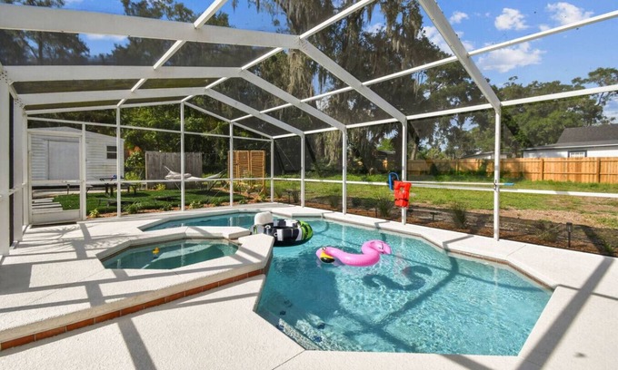 Relax in this modern 3-bedroom home with a pool, spa, and firepit. This home is perfect for family getaways! Located in peaceful Sorrento, just 36 miles from Walt Disney World and near beautiful downtown Mount Dora which is known for its dining, shopping, and charm. Enjoy privacy, parking, corn hole, Blackstone BBQ grill, hammock, and newly renovated kitchen & bathrooms. Sleeps 6 with 1 king & 2 queen beds. Extras include coffee bar and washing machine. Sorrento is safe, clean, and beautiful!
