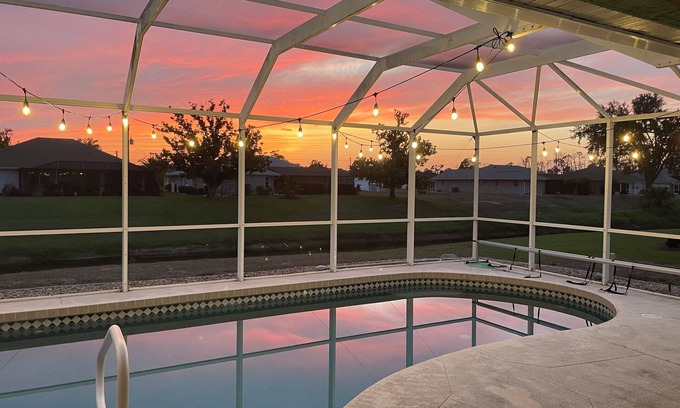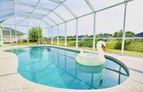 Outside, you will relax in style with a large, heated pool with covered lanai, family size table and chairs, and lounge chairs to soak in the sun. Behind that you will find a man-made, freshwater canal where you can watch the Florida wildlife or throw a line in the water and enjoy some fishing.
