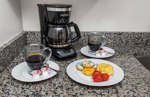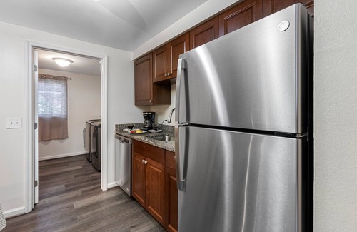 The fully equipped kitchen makes dining in a breeze. Enjoy stainless steel appliances, a full-size refrigerator, microwave, coffee maker, toaster, cookware, and all the utensils you need. Whether you’re preparing a simple breakfast or a gourmet dinner, you’ll find everything at your fingertips.