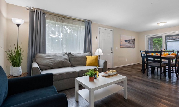 The open-concept living room is a welcoming space to relax and recharge. Lounge on the plush sectional sofa while streaming your favorite shows on the flat-screen smart TV. A large window fills the room with natural light, making it a bright and cheerful spot to unwind.