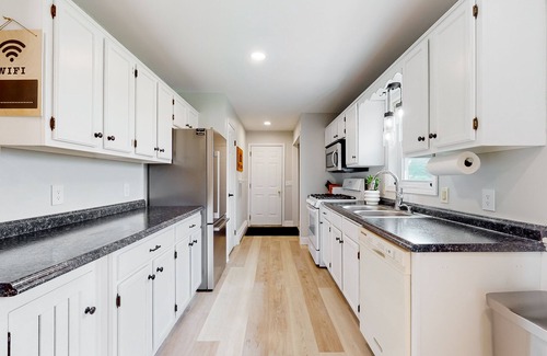 This peaceful and comforting home boasts a well-equipped, galley-style kitchen to help you brew up your morning coffee, whip up quick snacks for days on the lakes, or prepare full-course meals to enjoy at the adjacent table or outside on the covered and furnished deck. After meals, play a few yard games in the large outdoor space, or head back inside to stream your favorite channels in the main living area. If you're craving a little friendly competition, head downstairs to the furnished basement complete with a Ping-Pong table and a dartboard. Here, you'll also find a second TV and seating area as well as a quiet nook with two desks for remote work or schooling.