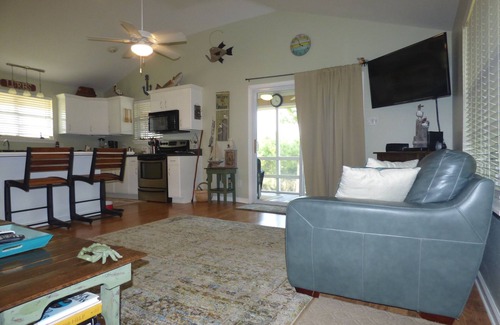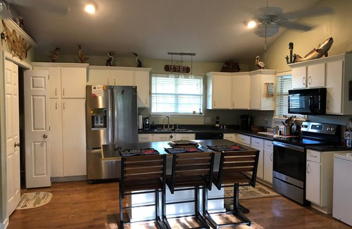 Enjoy a nice getaway in this fully furnished two bedroom/2 bath home on the bayou. The living room has a great view of the bayou and its wildlife and is furnished with all the comforts of home. Relax with a nice cup of coffee or a glass of wine on the screened in porch. The kitchen has all the necessary appliances and spices, as well as a large island with plenty of bar stools. Both bedrooms have queen sized beds, one full bath in hallway and the other in the bedroom. The yard is large, fenced in with gate across driveway, a dock that is fenced, hammock for relaxing and even a fish cleaning station!