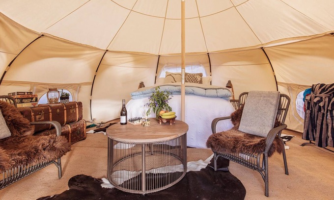 Each 5m diameter Lotus Belle tent has a queen bed, luxurious linen, feather topers and duvets, mohair and woollen throws, sheepskins and for the outside bean bags, camp chairs and table. A continental breakfast is included, eggs too if the hens are laying. Quality NZ teas and coffee provided. An "Off the Grid" experience with solar lighting, lanterns and USB charging ports.