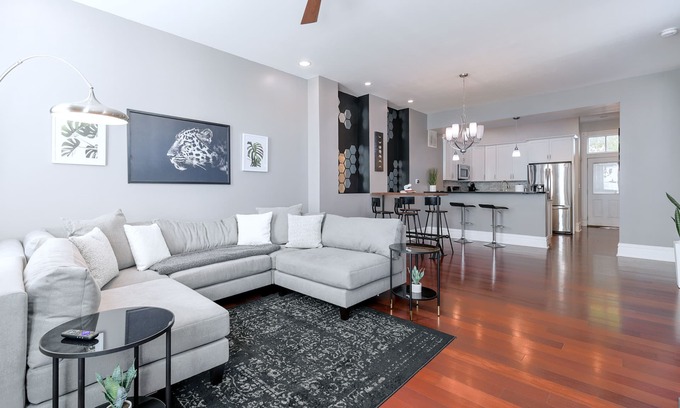 Feel invited immediately with a bright & open floor plan upon entering. Two bedrooms are on the 2nd floor, and the third is on the top floor. The basement contains an office and a secret speakeasy bar/lounge. The backyard is fenced and has comfortable seating and string lights to provide a relaxing experience for our guests.