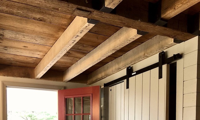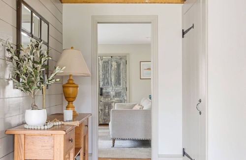 This farmhouse sleeps seven. 1 half bathroom on the first floor and 1 full bathroom on the second floor, 3 bedrooms on the second floor, a cozy living room with electric firepit, bookshelves, and a large desk for remote workers. The master bedroom contains a closet, a queen bed, a flat screen TV, vaulted ceilings with exposed beams and a small balcony overlooking the backyard landscape. The remaining rooms contain queen sized beds (one additional trundle bed) with flat screen TVs and closet/drawer space. Also, a washer and dryer are situated on the second floor.