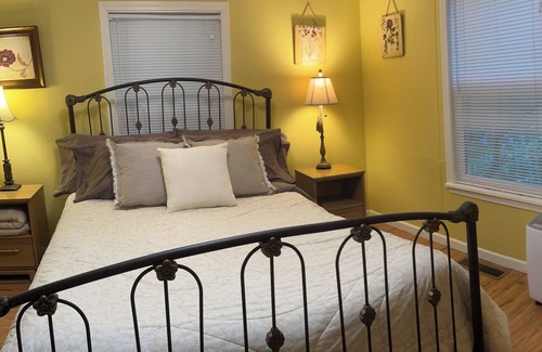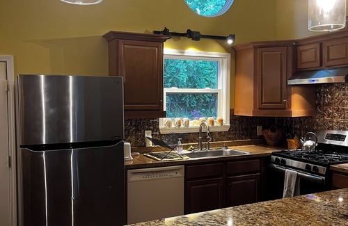 There is coffee, filters, sugar, non-dairy creamer, for a drip coffee maker. Also a microwave, gas oven/stove, full-size refrigerator, and dishwasher in the kitchen. No paper plates or plastic utensils here, you’ll have place settings for 6 with stainless steel cutlery, ceramic coffee cups, glass highball vessels, wine glasses and water glasses. Speaking of water, you’ll be drinking delicious well water from the tap. Views of nature out of every window, depending on the time of year, include blooming Dogwood trees, Japanese Maple trees, azalea, irises, roses, and much much more.