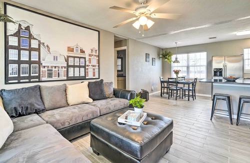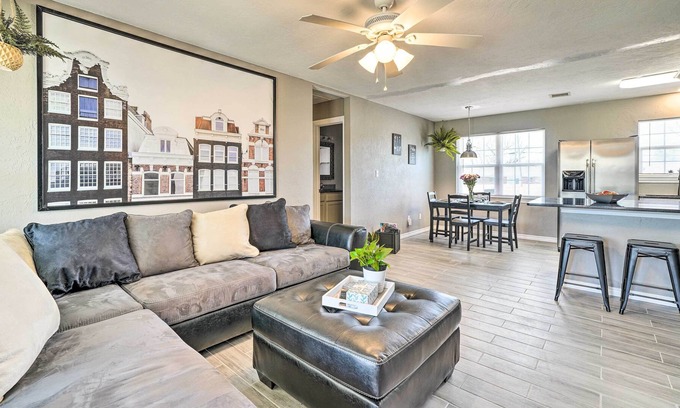 Whether you’re visiting your favorite college student or looking for a fun-filled family getaway, this Moore vacation rental has what you need! Nestled in a quiet neighborhood just 10.5 miles from downtown OKC, the 3-bedroom, 2-bath home boasts a fully equipped kitchen, an en-suite bathroom, and a single-story interior. Embark on a kid-friendly outdoor adventure at Hurricane Harbor, catch a Sooner game at Gaylord Family-Memorial Stadium, or simply relax at ‘home’ with Netlix on the Smart TV.