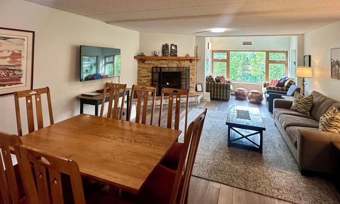 We replaced the flooring throughout with all weather luxury vinyl and the bathrooms have all new tile floors. We have 3 new bathrooms, 2 of them have walk-in showers, one has a tub/shower combo. Fresh paint, lighting, and fixtures throughout! Our favorite upgrade is the unobstructed view of the river, lake, and ski lifts from the open, large family room with fireplace. The modern, fully stocked kitchen is open to dining and family room, large open space for groups. The TV is mounted and can be angled for optimal viewing. We have 2 bedrooms and each bedroom has 2 queen size beds. 4 total beds for all different type travel companions, no bunk beds! Master has mounted TV as well. New furniture as well.
