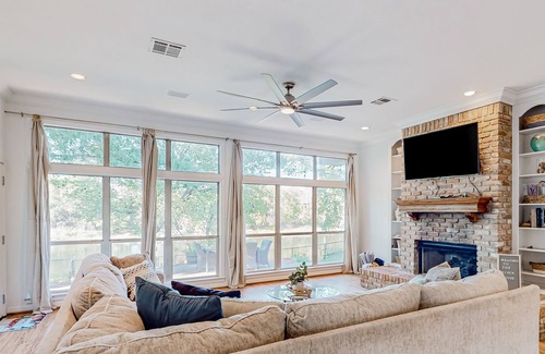 When it comes to outdoor living, this riverfront home has it all. Spend tranquil evenings relaxing on the patio, which is furnished with comfortable furniture, as you listen to the Brazos River babble. Find a covered BBQ area with a built-in gas grill and a smart TV, a firepit where you can gather to roast s'mores, and a nice outdoor dining area to enjoy your meals alfresco.