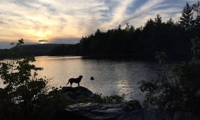 The cabin is 100 feet from the rocky shore with a path from front doors to the water. There are uninterrupted views to the north up the pond. We are on the southeast side of the water so we get beautiful sunsets.