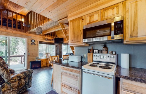 After a day of hiking, fishing, or dipping your toes in the rushing waters below, come back to the house to light the gas grill on the deck, sit down at the picnic tables for dinner, and tell stories around the firepit in the fresh mountain air. Inside, the tongue and groove pine living space includes a well-equipped kitchen with every essential, a breakfast bar, and a TV surrounded by a sofa and comfy recliners. The cozy sleeping spaces await upstairs in the loft.