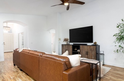 Renee Getaway is an intimate 3 bedroom 2 bathroom home Tucked away in North Phoenix. Here you can escape from the day to day life and relax in the airy and bright home, with its inviting swimming pool and water feature, the private yard and its gas grill. Inside you will find a modern Kitchen with all the necessities you need, overlooking the living room and its large HD Tv and large leather couch.