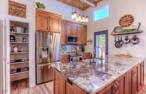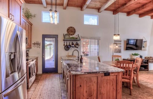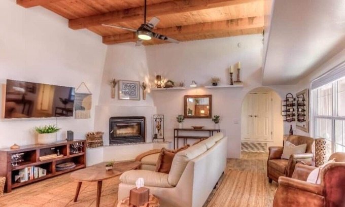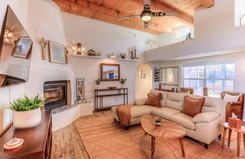 The Renewal Retreat home is less than a 10 minute drive to some of Tucson's best hiking and biking trails. And across the street from the famous Tucson Loop - 200 miles of paved cycling trails linking all of Tucson! This stylish place to stay is perfect for anyone who wants to escape to the desert to renew and refresh. The home is a Tierra Santa Fe model designed with rare wood beamed ceilings and corner beehive fireplace, custom Davis Kitchen with Alderwood cabinets, Stainless steel appliances, granite countertops, a Shaw Farmhouse sink and enclume pot rack. This three bedroom, two bath split floorplan home offers great relaxation in the lovely primary suite with separate access to the large front courtyard and two cozy secondary designer bedrooms. Tenants will enjoy endless sunsets from the orange slice patio looking west towards the undisturbed natural desert setting of Tucson's Fantasy Island Mountain Bike Park. Timed outdoor decorative string lights on both front and back patios offer warm illumination for extra ambiance and security. Additionally, Civano has two community swimming pools, tennis and pickleball courts for a fee. If you are interested in this during your stay, there will be a onetime $35 HOA access fee paid in advance.