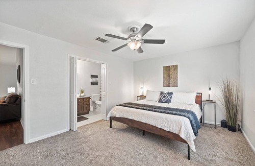 The house features 4 bedrooms and a game room. The entrance greets you with a cozy reading nook equipped with 2 chairs and a workspace. An open layout connects the living room, kitchen, and dining area. The master bedroom boasts a king-size bed with a private bathroom, while other rooms offer a mix of king, queen, and full-size beds. A shared hall bath is also available.