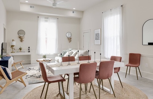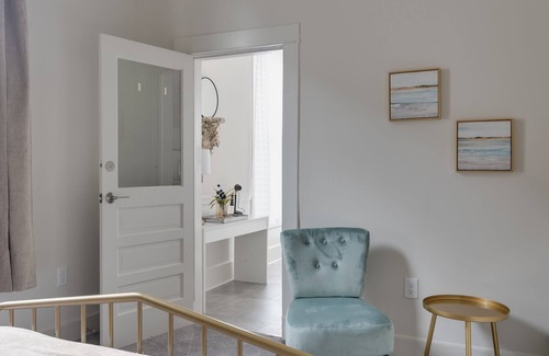 Upon entering the unit you will find yourself facing the original staircase leading you to the master bedroom with en suite and the spare double queen bed family bedroom. To the right is the first of many large bedrooms with a king size bed, walk in closet created from the original jail safe, and Jack and Jill bathroom that leads into the kitchen. To the left are 2 separate bedrooms that house the 2 twin beds and 1 queen bed, respectively. Past the bedrooms is the open concept living room and kitchen. Here you will find plenty of space to cook family style meals and relax to your favorite shows or games with your fellow guests. Upstairs is the main bedroom, with king bed, and ensuite; along with family bed room with double queen size beds and shared hallway, full bathroom. You will also find the full size washer and dryer upstairs.