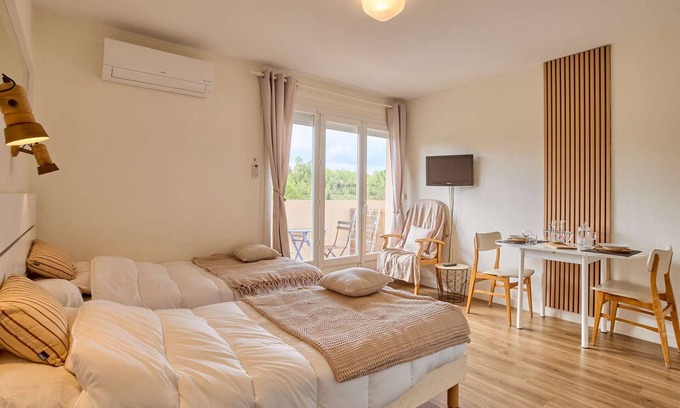 This bright and functional studio is ideal for a pleasant stay in the Gers region. This renovated, air-conditioned studio with a 22m² balcony is located on the 1st floor of the residence and faces south. It features two single beds, a television, a dining area, and a kitchen equipped with a mini-oven, microwave, electric stovetop, refrigerator, and a Senseo coffee maker. Its bathroom has a shower, vanity unit, and toilet.
