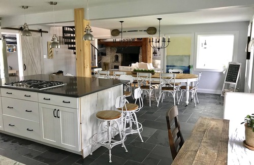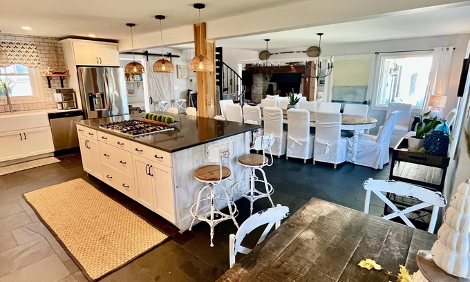 This home is brand new to the market, having just been fully renovated and redone in the Spring of 2017. It truly offers the best of both worlds with all of the modern amenities of a new home but the original charm that is characteristic of this charming historic community. The living areas in the house have expansive views of the Bay and a beautiful open floor plan with hardwood floors and slate throughout every room. The dining room is an idyllic gathering area for the whole family, featuring a large farm style dining room table that seats 16 people.