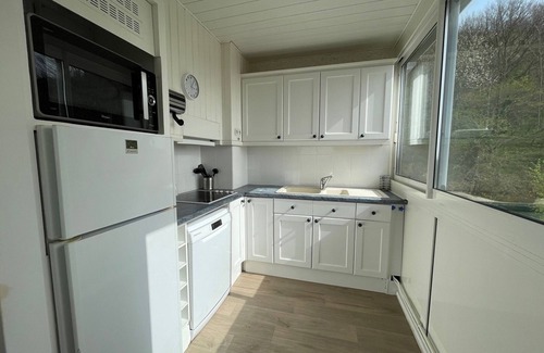 Superb panoramic views of the sea and the coast from this fully renovated apartment located on the 3rd floor (elevator from the 1st). Ideally located, the beach and shops are a 10-minute walk away. It features an open kitchen (ceramic hob, dishwasher, microwave) opening onto a large living room with a balcony overlooking the sea. One bedroom with three single bunk beds (90 cm) and one bedroom with a double bed (140 cm) and a beautiful bathroom (shower, washing machine) make it an ideal place to stay for 5 people.