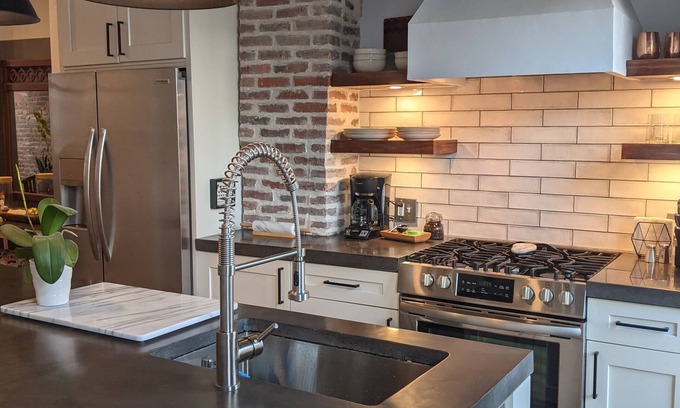 The kitchen has been fully renovated with new stainless steel appliances and concrete countertops, open shelving and a large island! The kitchen is fully stocked for cooking with cookware, small and large appliances. The kitchen and dining room are open concept with a large island with seating for 2 and a dining table with seating for 2. The kitchen design has been written about in magazines and featured online! It’s a real stunner!!