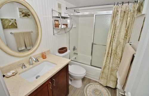 The second bedroom accommodates up to three guests as it holds a full/twin bunk with a twin trundle. Guests also have plenty of dresser space for personals and a TV. The second bathroom is similar to the primary's as it has a glass-enclosed bathtub and plenty of soft bath towels.