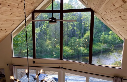 The home can sleep up to 13 in beds. The fully stocked kitchen has newer appliances and everything you need with room to prepare your meals. Enjoy your meal on the large kitchen table that seats 8-10. In the family room you will find a large comfortable sectional couch to seat many guests and cozy up to the large wood burning fireplace & 65" Smart TV. (Limited Firewood provided as a courtesy) There are also two additional family room chairs to move around. The main level then boasts a nice size bedroom with Queen bed and 43” Smart TV. There is also another main level bunk room that has a Double over Double, a Single over Single and a slide-out Trundle. (Sleeps up to 7) There is a 43” Smart TV as well as adult size PAC-MAN arcade unit with 7 cool games! Bedroom also has many family friendly board games & Nintendo Classic. A nice size full bathroom with shower completes the main floor. A Samsung Washer/Dryer is located on main floor as well. (Laundry Soap provided) Upstairs you will find a loft that sleeps two on the Serta futon. Beyond that is a Master bedroom suite with King bed and its own full bathroom, tub/shower and 50” Smart TV. Want even more space to spread out? Head out into the large 12’x22’ three seasons porch where you can open it up and listen to river/nature or close it during cooler months, turn on the electric fireplace & relax, play board games or watch your favorite game on the 55" Smart TV. (Seats up to 12) There is also a two-player tabletop Marvel Superheroes Arcade game with 4 fun games! Plenty of comfortable seating in porch and additional room to hang your fishing rods, waders, skis and other gear.