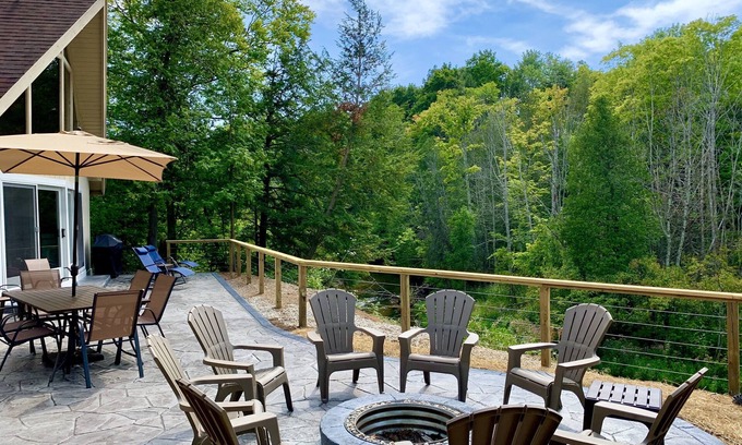 Unwind and relax in this tranquil, private lodge nestled along the beautiful Betsie. Set on 8 acres, this pristine and newly renovated property offers a spacious open floor plan, surrounded by a variety of trees and 600 ft. of private river frontage. The Betsie River is known for its steelhead and salmon along with trout fishing. Walk the scenic short trail down to the low part of our river frontage where you can easily walk right into the Betsie to fish, play or launch a kayak/canoe/tube. No dock needed and safe for all ages. There is also a sitting area down there to relax and watch the wildlife, plus a 2nd firepit. Not uncommon to see deer, owls, turtles, eagles, wild turkeys, beavers and other wildlife on the property.