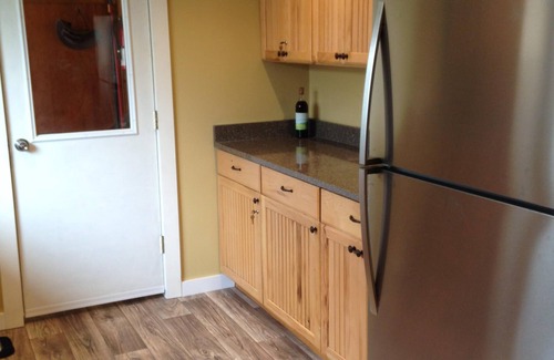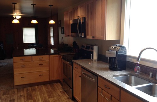 Relax in our large comfortable cabin. We are able to accommodate a small group or a large crowd with a second kitchen upstairs. We offer a fully equipped kitchen downstairs with stainless steel appliances, dishwasher, a large living room with a wood-stove (bring your wood or buy it at the local store).