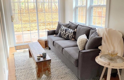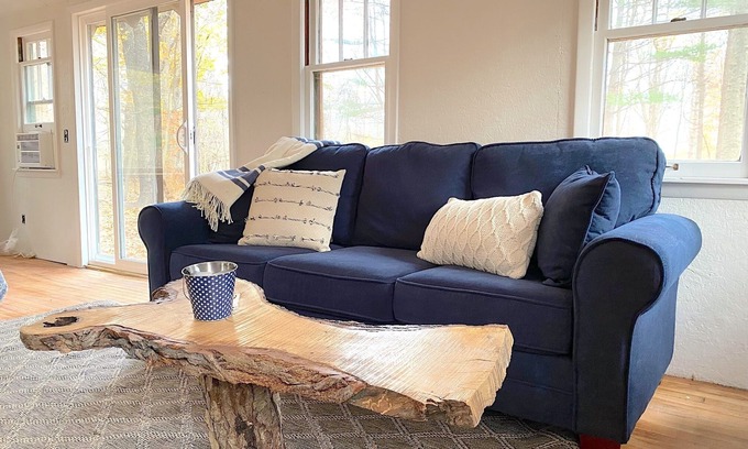The bunk house is a large space with a queen size bed, living area with a pull out couch (sheets and extra pillows available in the closet of the main house bedroom), large desk facing the woods, and its own deck. The bunk house is a perfect private space for a couple or for kids to stay and feel like they have their own space. The bunk house is only available seasonally (May - Sept) as it is not winterized.