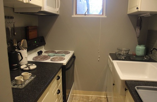 The Carriage house is located in the back of the main property. This is a renovated 2 story, 1 bedroom loft, with a full kitchen, and living room.