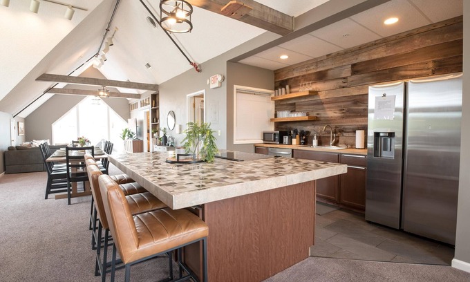 Our newly decorated condo, located above the Brown County Visitor Center, offers breathtaking views of the village from the spacious windows. With accommodation for up to six guests, our open layout features a full-size kitchen with an island, ensuring everyone has a seat at the table. Our comfortable couch provides ample seating for enjoying your favorite TV shows. For large groups, The Loft can be combined with other rooms, such as the Fire and Rainfall Room, Wine View Room, or the Girlfriend Getaway Suite, offering additional room options and privacy. Book your relaxing getaway at The Loft now! The price structure is for a maximum of six people. If you wish to have more than six guests, please consider the Fire and Rainfall Room, Wine View Room, or Girlfriend Getaway Suite. The Loft by Moondance includes one queen bed (bedroom one), one bunk bed (bedroom two—twin beds), one twin bed (bedroom three), one full bed (bedroom four), and a futon. Please note, while you'll have complete privacy within your unit, the hallway is a common space for other unit renters on the same floor. ALL EVENTS, DAY GUESTS, AND PARTIES ARE PROHIBITED WITHOUT PRIOR WRITTEN APPROVAL FROM PROPERTY MANAGEMENT. Effective July 1, 2025, the county has raised the innkeepers tax from 5% to 8%.