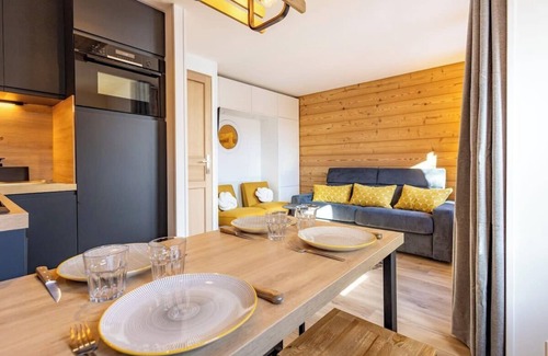 This 28m² cozy apartment is perfect for a mountain getaway, offering a chic and warm setting. It can accommodate up to 5 people, with a bedroom equipped with two bunk beds (suitable for adults) and a pull-out bed, as well as a living room with a comfortable convertible sofa. You’ll also enjoy the balcony with a breathtaking view of the slopes and the surrounding mountains. The modern bathroom and new amenities will ensure your comfort. A ski locker is available to make your ski days more convenient. This apartment offers an ideal location for your activities, right at the heart of the Three Valleys ski area.