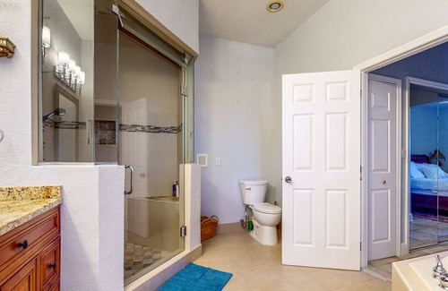 The plush main living room is the perfect area to host movie nights and the primary bedroom is just around the corner. Boasting elegant furnishings and an en suite bathroom, this room is an oasis in itself. Unwind in the jetted tub or in the equally impressive walk-in shower.