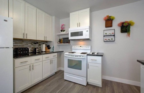 The newly designed kitchen has tiled backsplash and solid surface countertops, full-size refrigerator/freezer, oven, stove, dishwasher and microwave. All pots, pans and cooking utensils are provided. There's also a Keurig & French Press coffee maker with coffee, decaf and tea pods.