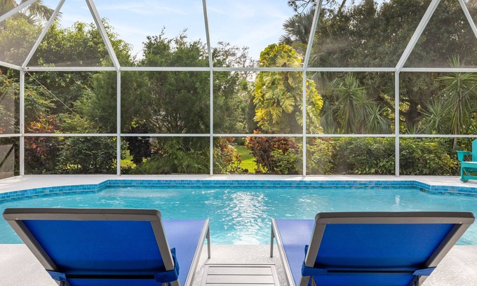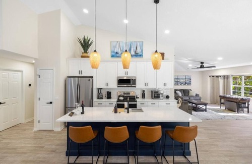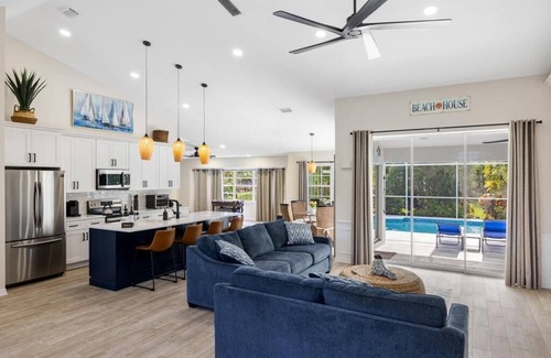 This concept 3 bedroom 2 bath house sleeps up to 7 with 3 bedrooms and an extra living room pull out couch. Family room has a 13 in 1 combo game table set which includes pool table, foosball, ping pong and air hockey! Gourmet Kitchen with quartz countertops along with dishwasher, coffee maker, pots and pans, toaster, blender, cookware, silverware, etc. Ceiling fans in each room, laundry room with washer and dryer. High speed Wi-Fi and smart TV’s with premium TV channels along with complimentary Netflix. The heated Pool is completely resurfaced and features colorful custom glass tiles. Weber grill along with table for 8 seats a perfect evening overlooking the mature backyard filled with tropical plants, flowers, and banana trees with a peak of a water view. A bike ride to Nokomis beach, 7 minutes to downtown Venice and only 13 minutes to the #1 rated white sand beach in US- the Siesta Key Beach. Provided beach equipment includes 4 chairs, umbrella and wagon. Starbucks, Dunkin Donuts Walgreens, Publix, banks, restaurants, etc. just a block away.