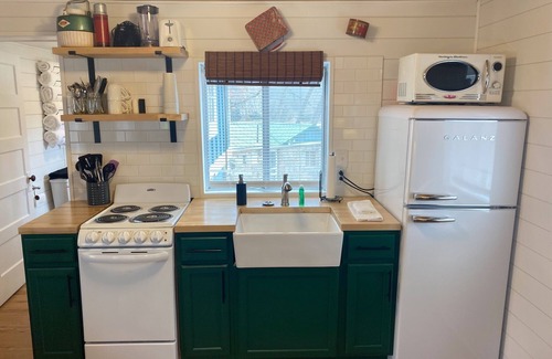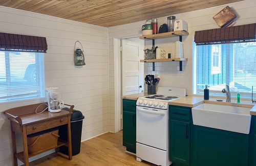 This cabin has a queen bed plus a full-size sleeper sofa. The dining table offers seating for 4 guests and the kitchenette is equipped with all necessities for preparing meals with ease.