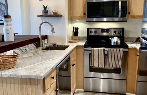 The kitchen is fully stocked with utensils, pots and pans, plates, glasses, cups, bowls, coffee maker/filters, toaster, blender and a cork screw. Just in case you want to cook up a storm. Otherwise, the Stratton Village offers plenty of dining options all within walking distance.