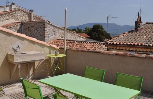 The Non-Smoking house is a traditional 'maison de village' and the foundation dates back to medieval times. The interior of the house combines traditional style with modern amenities. This house comprises five rooms and three bathrooms (one on each floor): the modern kitchen/dining room and bathroom (with no shower or tub) as well as glass doors to the terrasse on the top floor, and the full bathrooms with toilet, sink and shower and the master bedroom with a double bed and hall/office on the entry floor, and a second bedroom with a double bed downstairs as well as an intermediate bedroom with a single bed and powder room on the lower level, as well as the comfortable queen sofa bed in the living room upstairs which opens out onto large terrace upstairs (shared when the house next door is occupied, but with separate tables chairs and drying racks for each house). The house sleeps five comfortably, 6 adults and one infant in a pinch. We have a bed and highchair for a baby/toddler. The main room features a dishwasher, clothes washer, kitchen counter, dining room table, six chairs and easy chairs. A modern gas stove and North American-style refrigerator complete these rooms. The lower double bedroom in the house is centuries old and even incorporates a Roman tile and beautiful double vaulted ceiling! But note that the stairs to the lower bedrooms are rather steep.