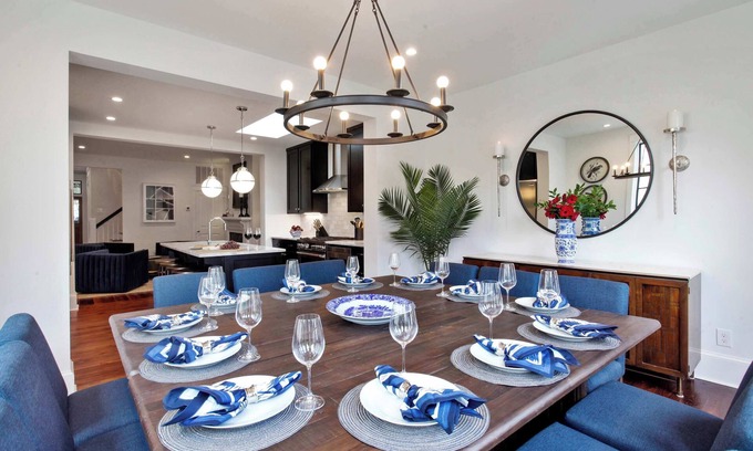 This upscale condo in Savannah can fit up to 19 guests with its 8 bedrooms, 5 bathrooms, and right next to Forsyth Park. With its modern amenities, including a patio, this home is great for those who want to be near everything Savannah has to offer. The professionally designed spaces offer open-concept layout and an eat-in kitchen perfect for entertaining.