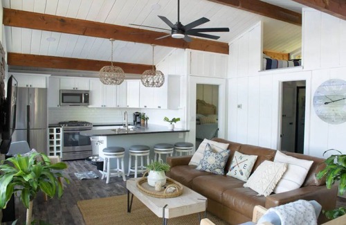 FIRST FLOOR: has an open concept kitchen living room space featuring modern coastal decor, electric fireplace with 2 bedrooms and 1 full bath.