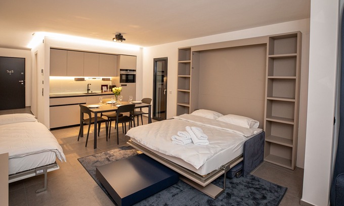 The apartment sleeps 4 people. The living area, which is elegantly decorated, includes a comfortable sofa, flatscreen tv and coffee table with a dining table for 4 people. The sleek, open-plan kitchen has everything you might need for your stay: an induction hob, oven, fridge, freezer and a Nespresso machine.