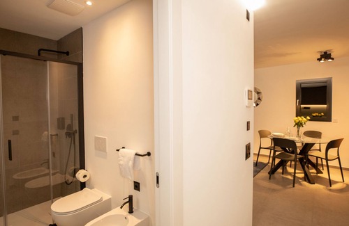 The stylish modern bathroom has a glass shower, basin, bidet and WC.