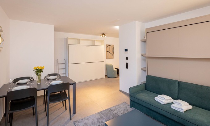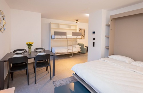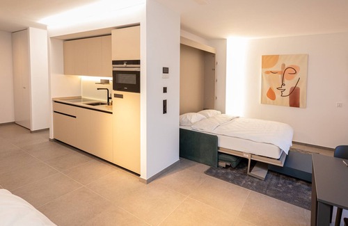 In a smart, contemporary residence, with its own bistro, this second-floor (with lift) studio apartment sleeps up to 4 people. It is an ideal base for a holiday or for a business trip in the region of Ticino.