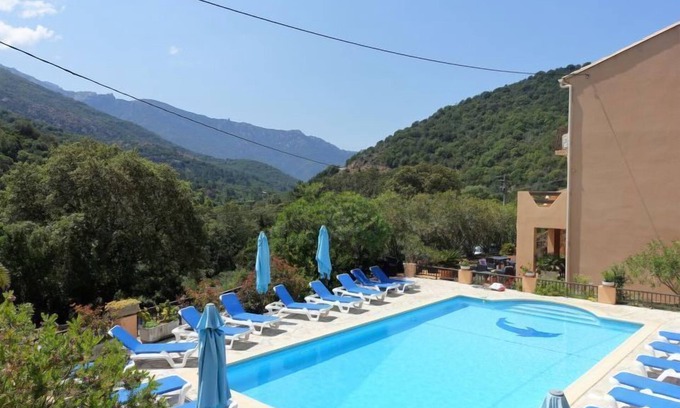 Serriera 6 km from Porto: Holiday development "Cabannaccia". On the outskirts Serriera, in a quiet position, 1.5 km from the sea, 1.5 km from the beach. For shared use: swimming pool (14 x 8 m, depth 100 - 130 cm, seasonal availability: 01.Jun. - 30.Oct.). In the house: reception, bar, bistro, WiFi, storage room for bicycles, washing machine (for shared use). Bread roll service and breakfast (extra). Parking. Shop 6 km, grocery 6 km, restaurant 1.5 km, bus stop "Porto" 5.7 km, shingle beach 1.5 km. Please note: car recommended. Baby equipment (extra). The photograph shows a typical example. Additional accommodations can be booked. The "Cabanaccia" complex comprises of a hotel as well as several buildings (accessed by steps) grouping the holiday properties.