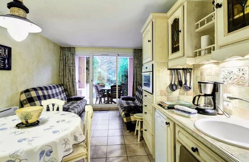 Equipment: Characteristics of the vacation rental: 2-room apartment for 5 people. Located on the ground floor East facing garden and terrace. Fully equipped kitchen: refrigerator with freezer space, hob, microwave, oven, dishwasher, classic coffee maker, crockery and cutlery. Facilities: television, air conditioning, hairdryer, safe, washing machine, ironing board and iron, children's equipment (baby bed and high chair), electric barbecue, crepe maker, mixer. Non-contractual photo.
