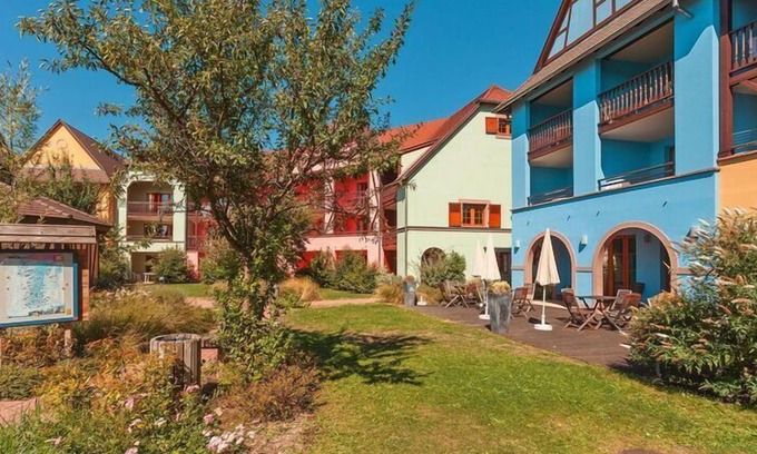 Modernly equipped and renovated in 2016 holiday complex with heated indoor pool, just a few meters from the ring-shaped town center. The small colorful houses with the apartments fit perfectly into the typical image of Alsatian villages, you will recognize the colorful buildings of your holiday home from afar. The location is ideal, wine lovers can start their visits to the caves, the wine cellars, directly from here. For younger guests there is a children's play area at the reception and a playground. Eguisheim is surrounded by vineyards and is considered the cradle of Alsatian wine. Grapes grow on the slopes surrounding the village, producing two excellent Grands Crus. Activities nearby : The pretty town of Colmar with its many tourist attractions, such as the House of the Heads, "Maison des Têtes", the Pfisterhaus, the Customs House and the canals reminiscent of Venice, is only 7 kilometers away and can even be reached by bike . But why not discover lesser-known places - just a few kilometers from Eguisheim are the pretty little villages of Gueberschwihr and Pfaffenheim, and a tour of their centuries-old town centers is worthwhile. Many well-signposted hiking trails of various durations also start from here. The partially steep ascent through vineyards to the Franciscan monastery Schauenberg is rewarded with a pretty view. A real Eldorado for climbers can be found near Gueberschwihr, from small rocks for children to numerous challenging sport climbing routes and boulder blocks, there is something for every level.
