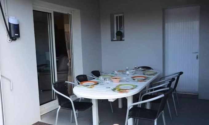 Accommodation: Only 1 km from the city centre and 1.7 km from the Grande Plage, this renovated holiday home offers all the necessary comforts for a pleasant stay. It consists of an entrance, an equipped kitchen (microwave, dishwasher, fridge/freezer), a living room/lounge with TV and a toilet.Upstairs you will find three bedrooms with 2 double beds, 2 single beds and 1 single mezzanine bed, as well as a bathroom and an additional toilet. A garage with washing machine is also available.The advantages of this seafront rental: a covered terrace with garden furniture and barbecue on a closed plot, private parking, a garage and Wi-Fi access. End of stay cleaning is included.Benefits included: