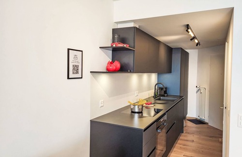 "Residenza Monte Brè - Apt. 203 Haus2", 1-room apartment 28 m2 on 2nd floor, south-west facing position. Fully renovated in 2025, comfortable and modern furnishings: open living/sleeping room with 1 sofabed (140 cm, length 200 cm), 1 double bed (160 cm, length 200 cm). Open kitchen in the entrance (oven, dishwasher, 4 induction hot plates, toaster, kettle, microwave, electric coffee machine, Capsules for coffee machine (Nespresso) extra). Shower/WC. Heating. Small balcony 4 m2, south-west facing position. Balcony furniture. Marvellous panoramic view of the lake, the mountains, the countryside and the city. Facilities: children's high chair, baby cot for up to 2 year olds (extra), hair dryer. Internet (WiFi, free, Bandwidth: 1'000 Mbit/s). Parking (extra) at the house. Please note: non-smokers only. NL-00012811