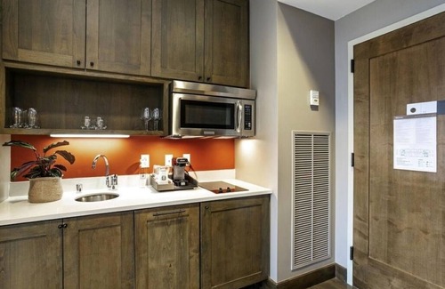 My privately owned junior residential suite has private balcony on 8th floor w/2chairs/end table, fireplace, king size bed, queen sofa sleeper with upgraded memory foam mattress, coffee maker, and kitchenette complete with 2 burner cook top, mini fridge, microwave, dishwasher, pots/pans and dishes for 4.